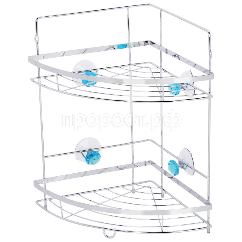 Полка выполнена из высококачественного хромированного металла и предназначена для хранения вещей в ванной комнате. Полка угловая и состоит из 2-х ярусов одинакового размера. Изделие крепится к стене с помощью декоративных присосок с имитацией бриллианта синего цвета или на саморезы (входят в комплект)."